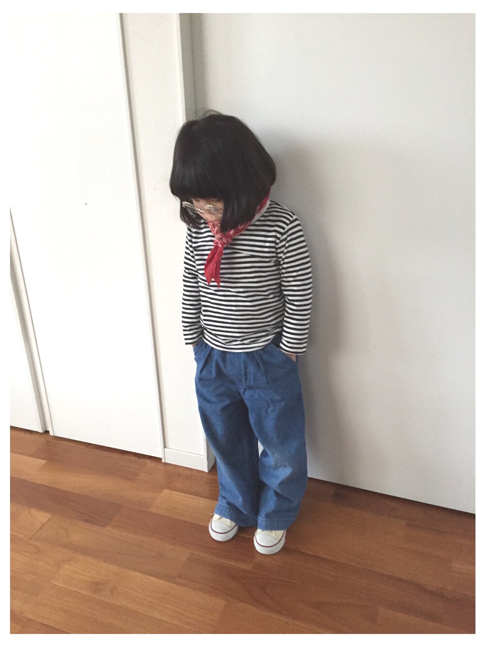 パパのバンダナを拝借。 赤がポイントになって可愛い♡