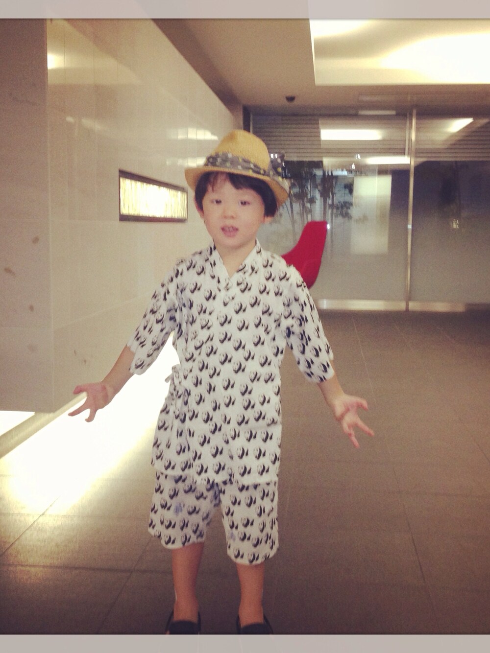 テーマ「夏の終わりの少年」 パンダさん柄の甚平に麦わら帽子、足元はクロックス。 近所の夏祭りに出かけました!