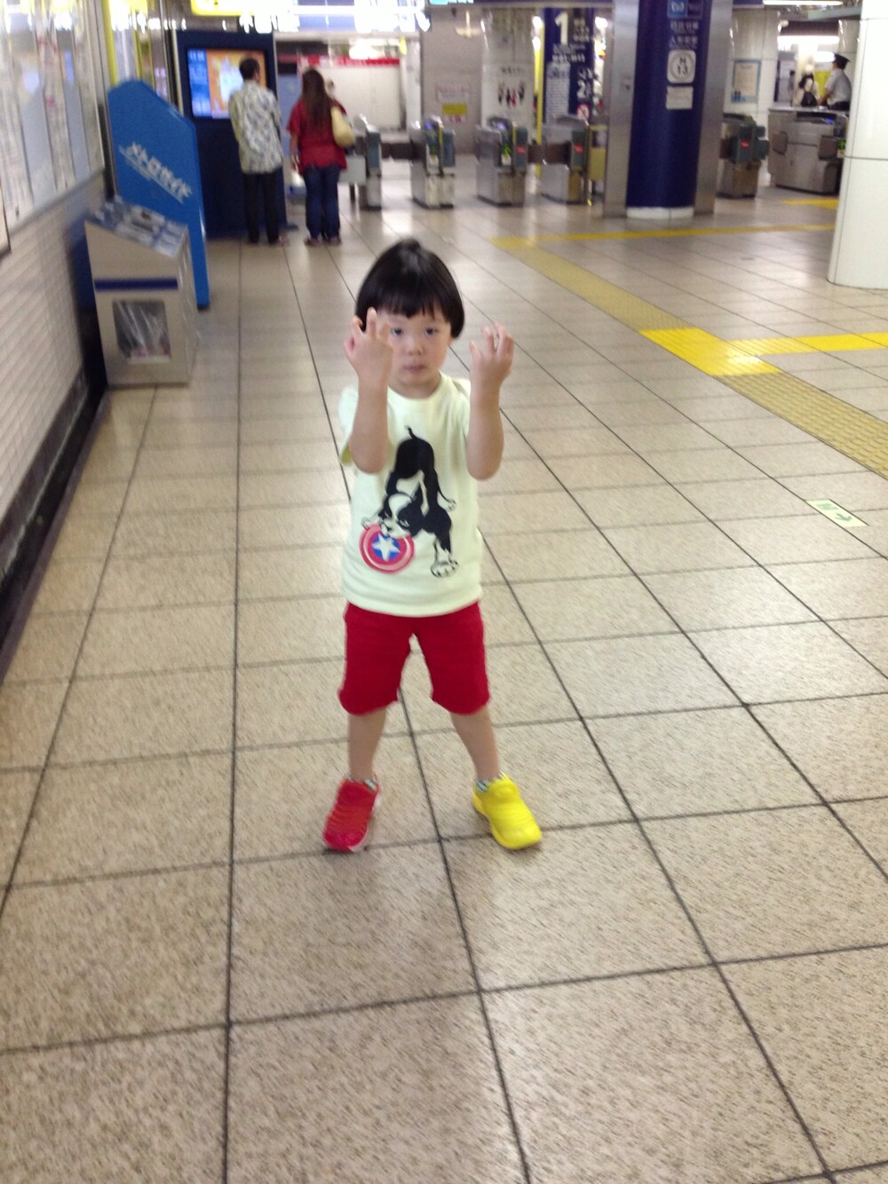 黄色いTシャツと、赤いショートパンツに合わせて、スニーカーも黄色と赤に!