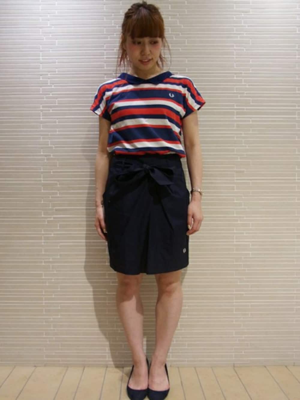 トリコロールのボーダーが目を引くトップスをボトムインすることで女性らしい着こなしに仕上がりました。