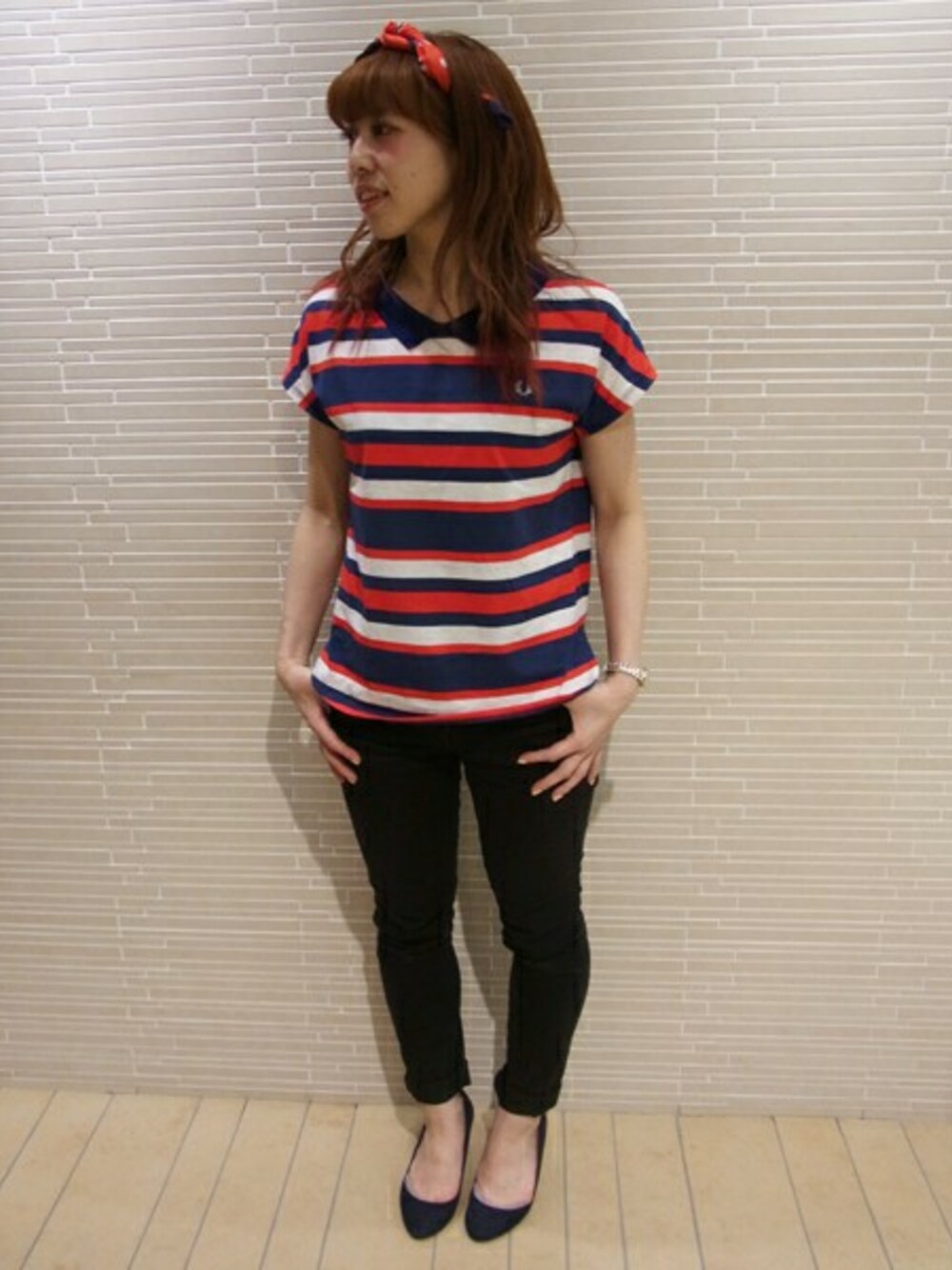 マルチカラーのボーダートップスをブラックアイテムと合わせることですっきりまとめました。