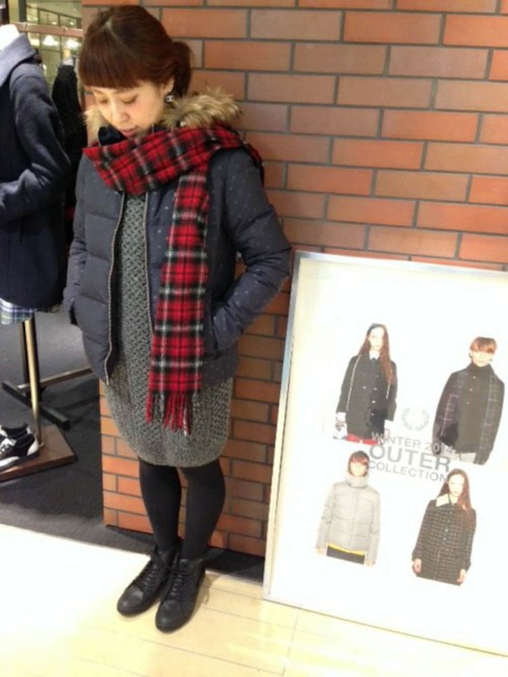 軽く着心地抜群のドットダウンにニットワンピ マフラープラスで暖かコーディネイト