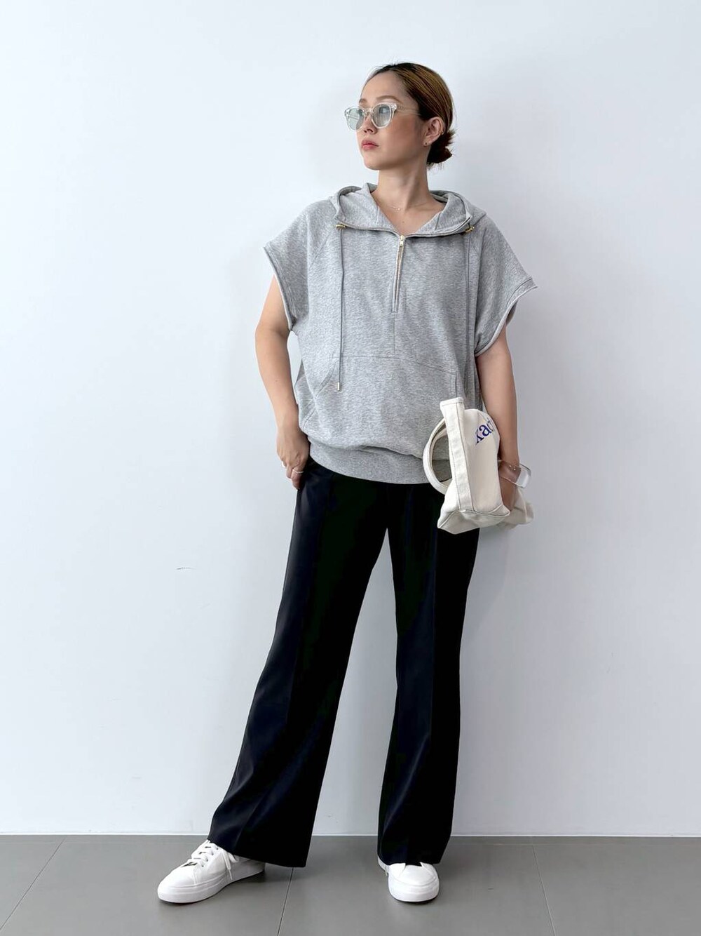 ⭐️スウェットパーカー 気温が高い日でも着られるよう、さらりとした表面感が特徴でとても薄手のミニ裏毛生地で作ったスリーブレスのスウェットパーカーです。 ゆとりある身幅+ノースリーブで風を通すので夏でもさらりと着ていただけます。 ノースリーブ型ですが二の腕にかかる袖丈なので、ノースリーブに抵抗がある方でも着ていただきやすい1枚です。 ⭐️ワイドストレートトラックパンツ カジュアルにも綺麗めにも穿けるパンツで、夏の少しリラックスするムードに合わせ、ほんの少しだけワイドなストレートシルエットになっています。 程よく膨らみのある素材なので、軽やかなTシャツやブラウスなど夏トップスと合わせるとスタイリングのバランスがカッコよく締まります。 パーカーにブラックのボトムを合わせて、キレイめカジュアルにまとめたスタイリングです。 シンプルなので、ロゴトートやアイウェアを合わせています。 ◾︎フォローしていただくと、最新スタイリングをすぐご確認いただけます😸 ◾︎も是非ご覧ください😸