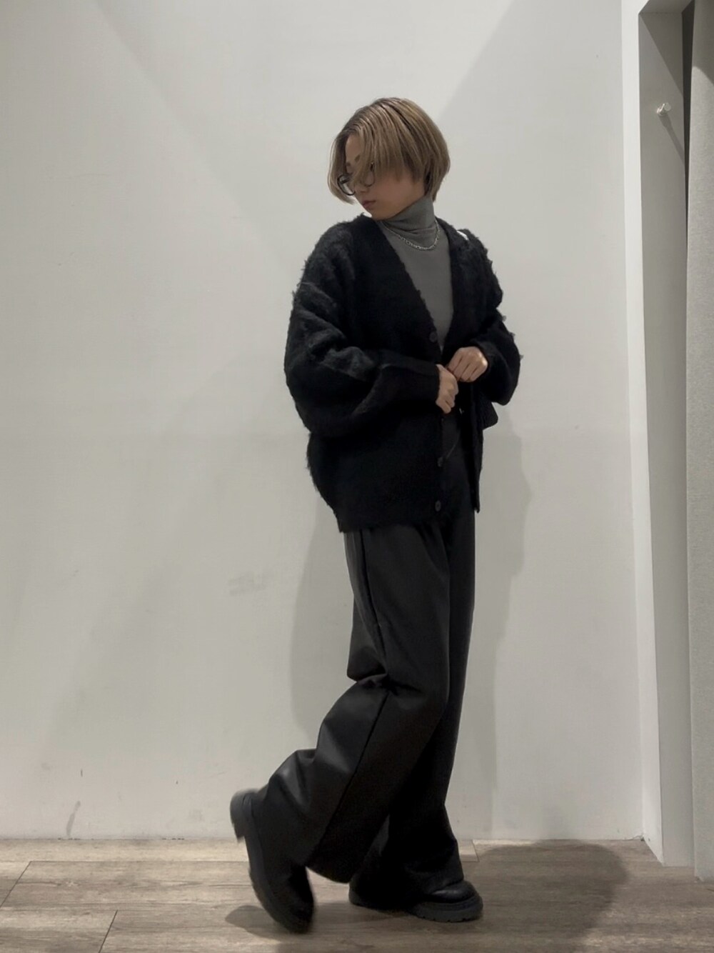 メンズのレザーパンツと合わせて甘すぎないコーデに🙆♀️