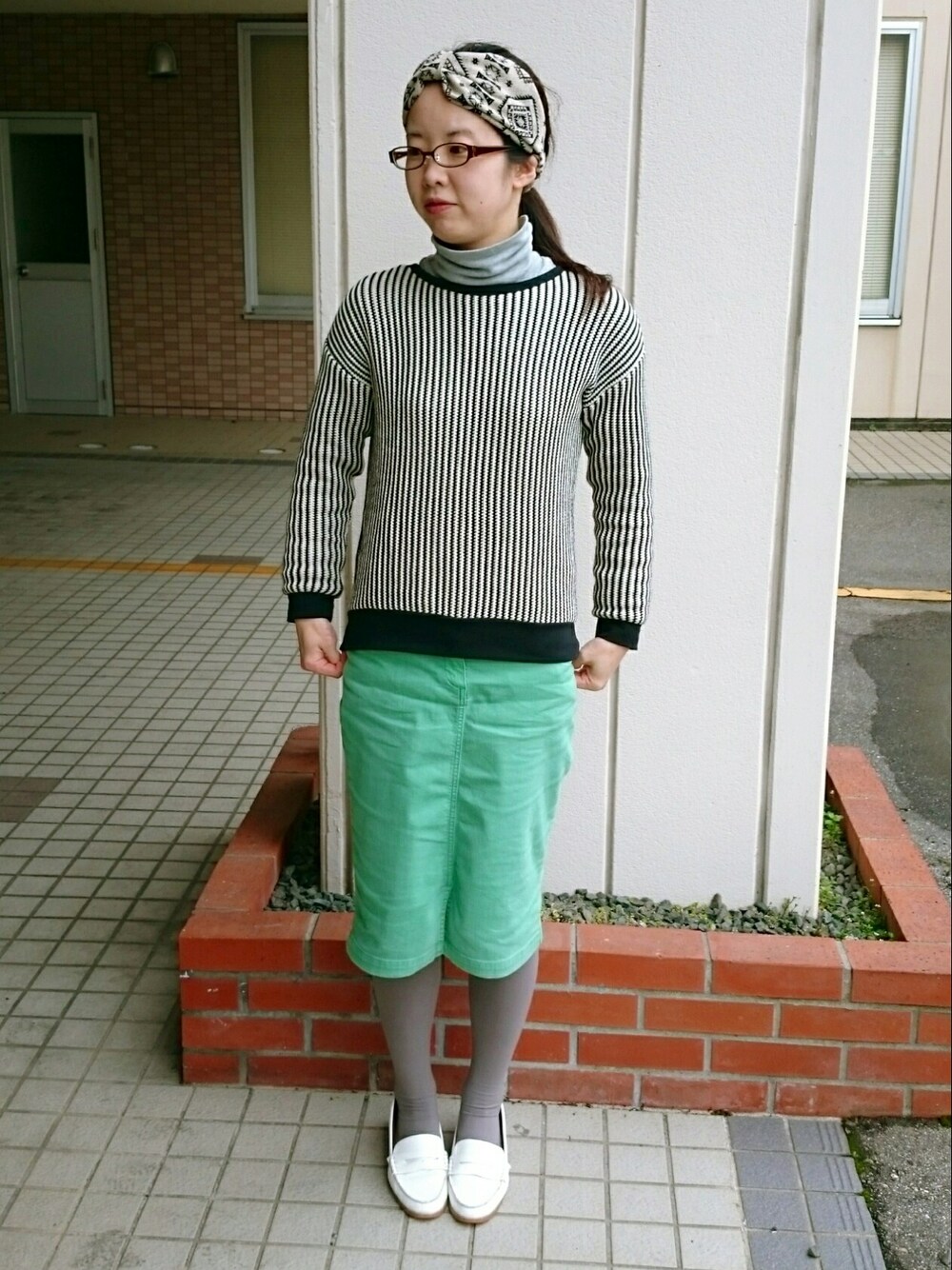 ストライプニットとヘアバンド 色合わせ😊🎵 春らしいカラーのスカート 古着屋でプチプラに😆💕