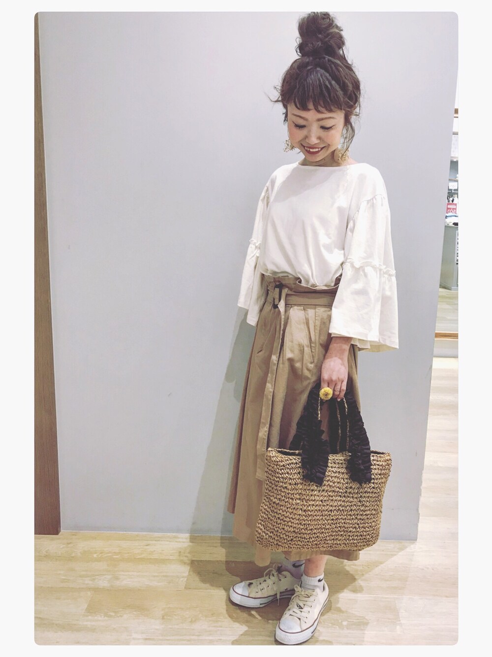 ご覧くださり、ありがとうございます☺️💕 フレアスリーブのカットソーに、やわらかいチノスカートを合わせました♡