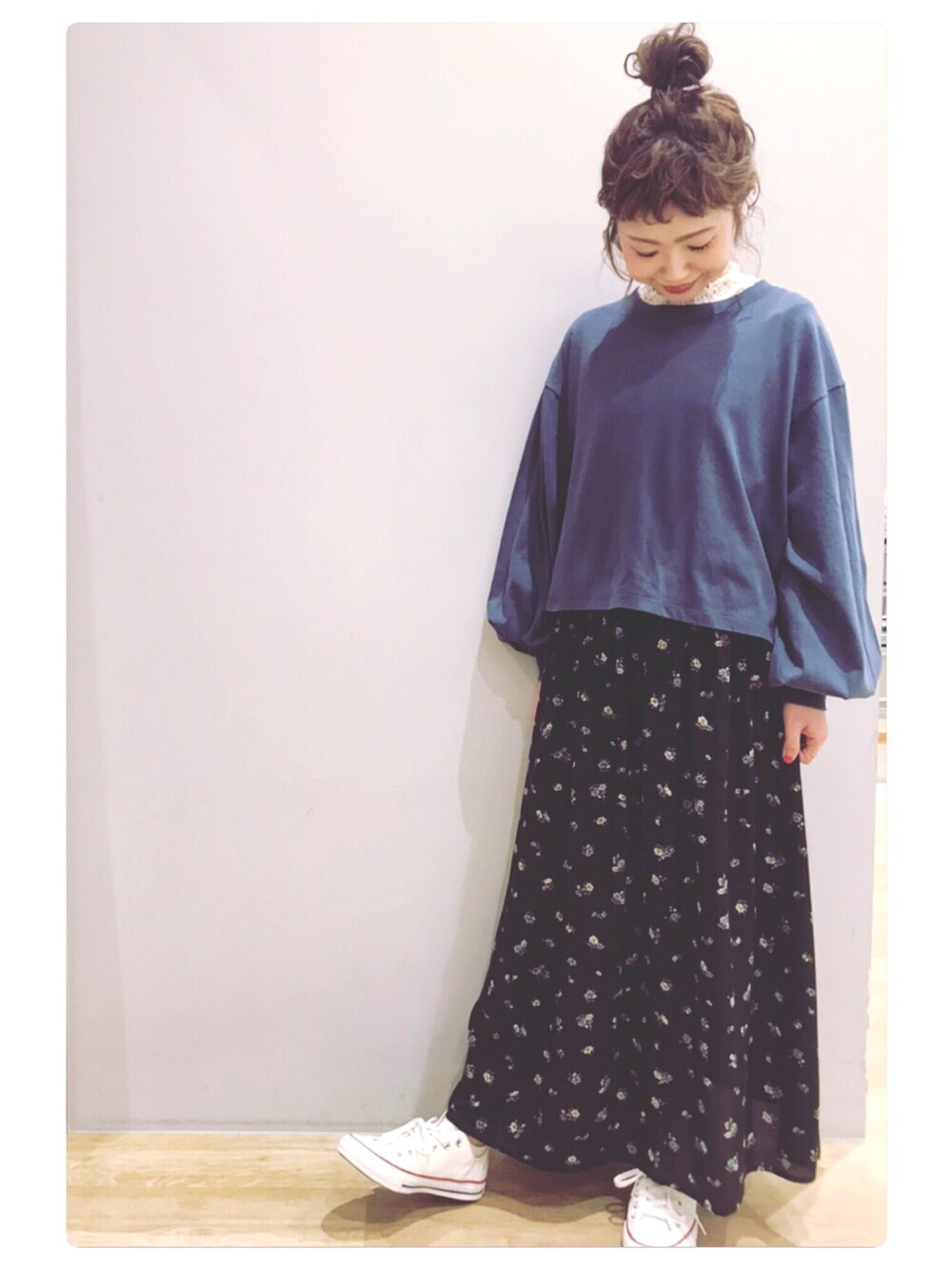 ご覧くださり、ありがとうございます😊 すきな丈ふわ袖シリーズのショートタイプ♡インナーに、レースを合わせて、花柄スカートで☺️💕