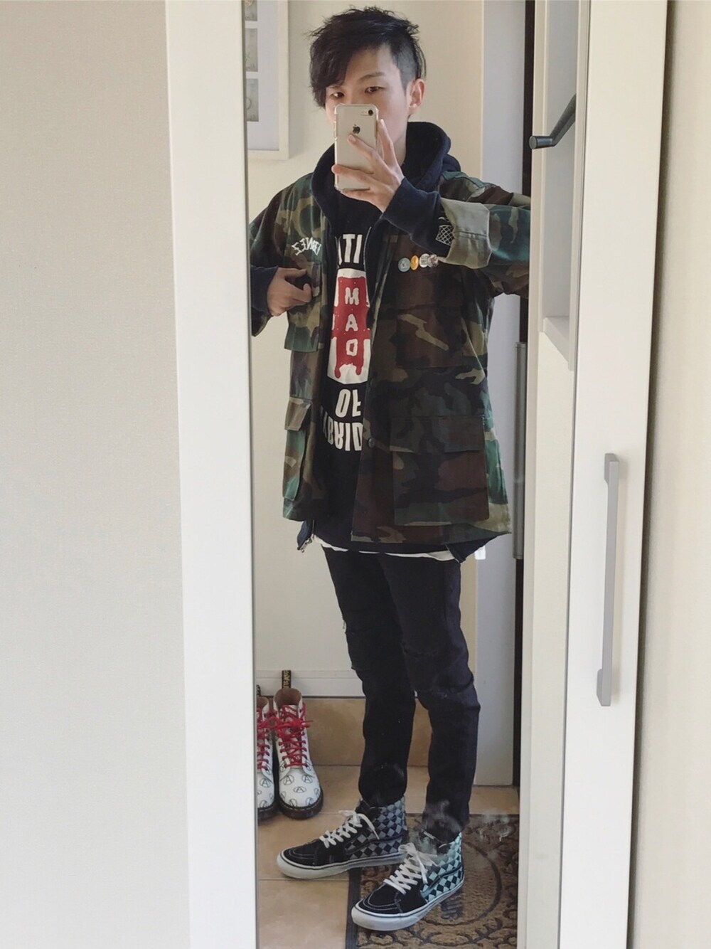 一昨日The Bonezのクアトロでのライブ最高に楽しかったです。終始ポジティブなバイブ貰って花粉症も吹っ飛びました(パルコ出た瞬間目痒くなりましたが)。Jesse超カッコ良かった。あんな楽しい空間創れるなんて凄いな。モッシュやダイブ盛んなライブに1~6歳ぐらいの子が5人ぐらい居て、居られるピースフルな空間も良かった。俺も音楽、ライブ、英語レッスンでもポジティブなバイブ持って帰ってもらいたいなと新しい価値観生まれました。 Vansの白黒チェックシリーズが金曜発売されてまた人気みたいですね。俺はこのUndercover x Vansのsk8hiがダイヤ傾きや色の組み合わせ好きです。Tシャツはhideも1stツアーで着てたThe Mad Capsule Marketsで1番カッコ良い初期T。The Bonezマーチの迷彩ジャケットはバッジ付いてると勝手に思い込んでたら付いてなく、1個バッジ物販でおまけ貰ったのは黒で合わなかったので、Rough TradeやThe WhoやらRadioheadとロンドン住んでた時に買ったので埋め合わせ。The Bonezのバッジや腕章持ってる方羨山です。 Fear of God 5thは値段が手が出ませんでした。