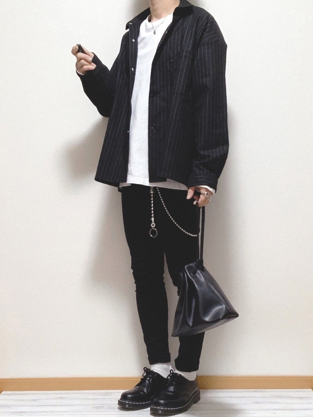 ストライプシャツ×黒スキニー×巾着バッグ×ウォレットチェーン もし少しでも良いなと思ったらお気に入り、いいね、フォローよろしくお願いします フォローして頂けたらお返しします