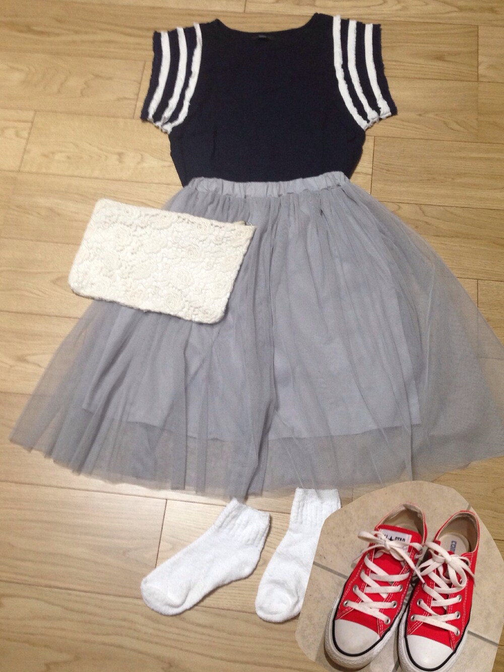 久しぶりのチュールスカート(*^^*) 靴下.flower bag.台湾で購入のクラッチ