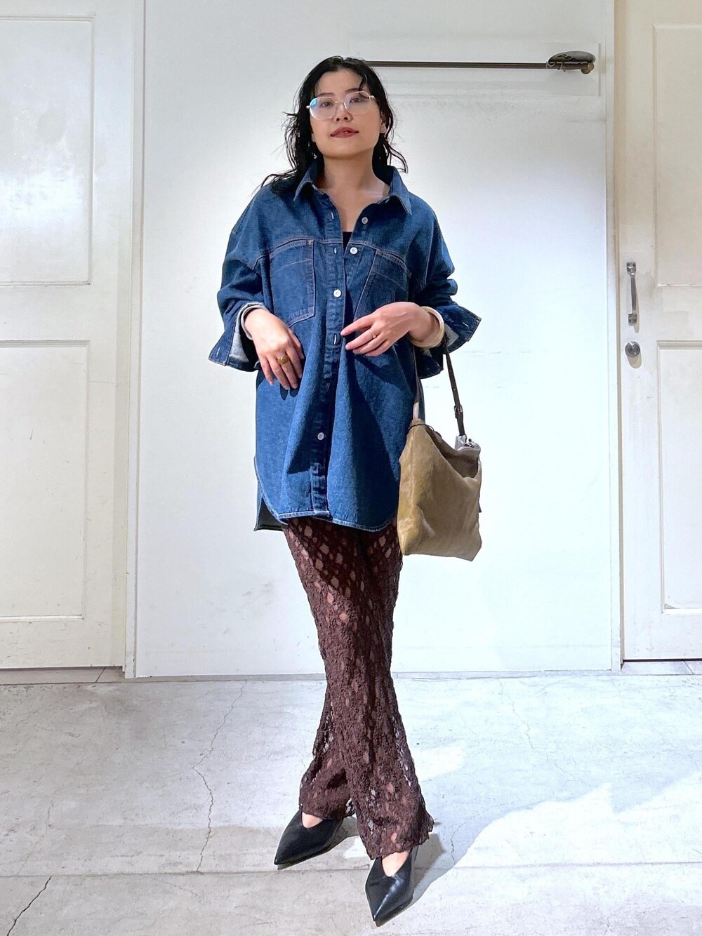ご覧いただきありがとうございます。 オーバーなデニムシャツにレースパンツを合わせてみました。 ※記載のないものは私物です。