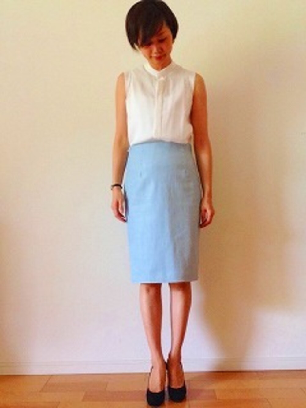 お仕事コーデ。 DES PRES(デプレ)のシャツに、ZARAのレザータイトスカートでかっちりと。 レザーなのに、重たく感じないのは、爽やかなブルーのおかげ♪