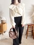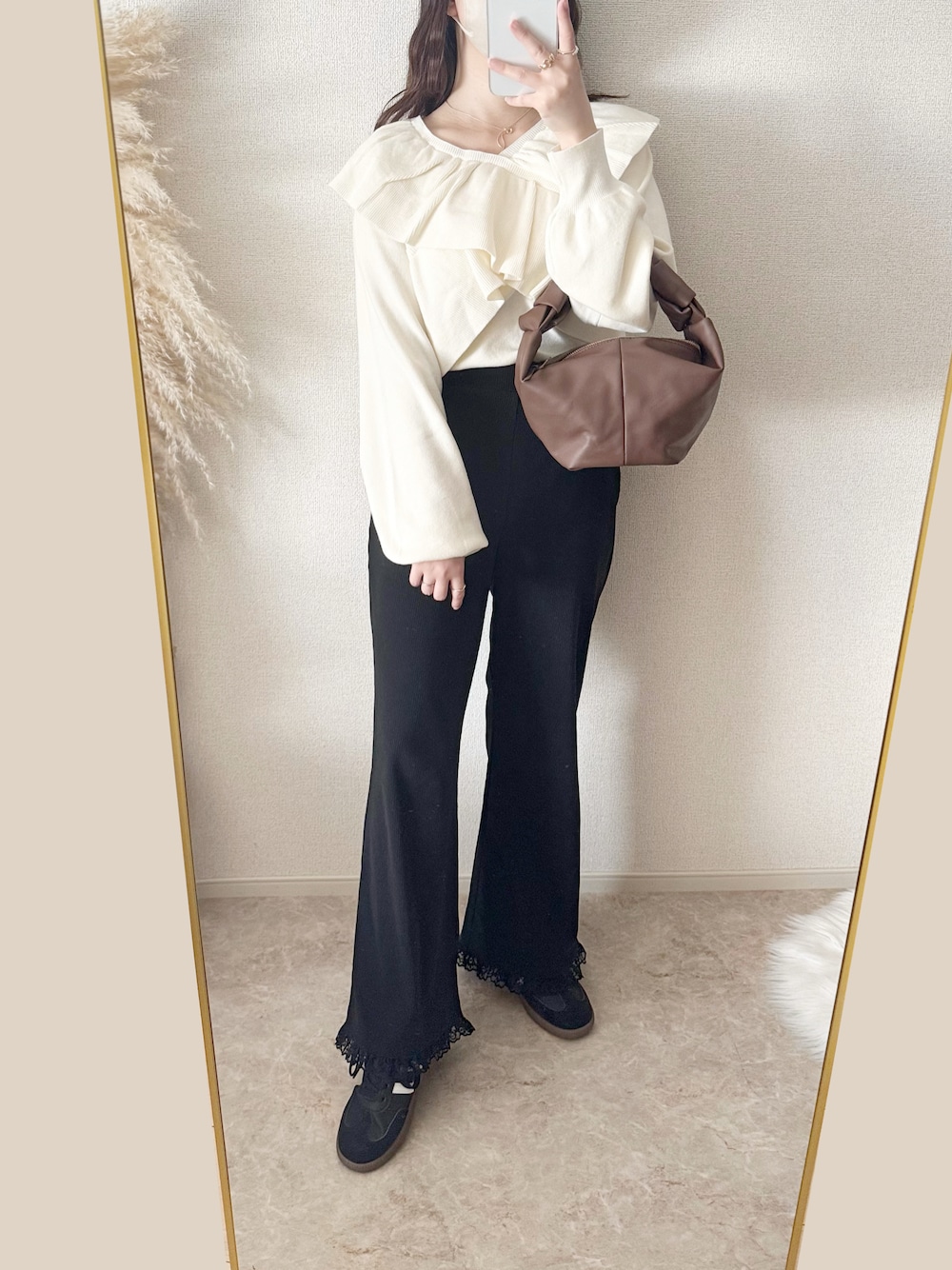 TOMOのニット/セーター「フェザーフリルクロスプルオーバー」を使ったコーディネート