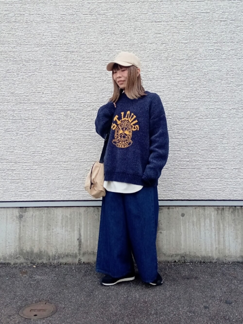 メンズのカレッジロゴニット。 モールニットでチクチクしないです◎ バギーパンツを合わせて全身ゆるコーデ。