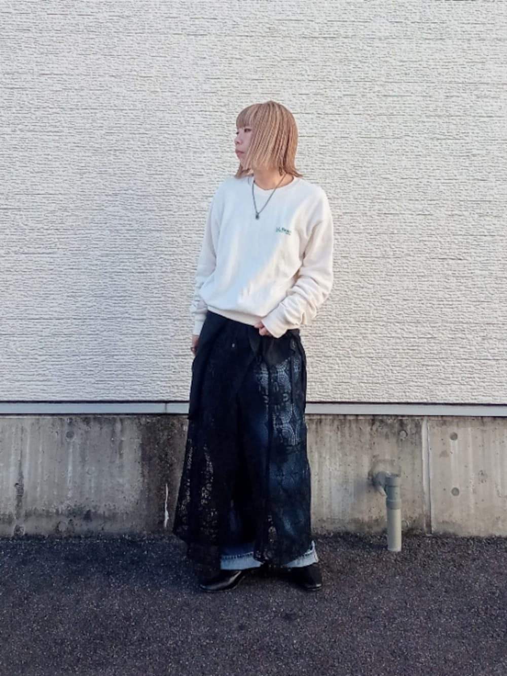 LLBeanのロゴが入ったシンプルなスウェット。重ねの襟がかわいいです。 巻きスカートはペチスカート無しでレース部分のみ使用して。 シャツを腰巻してカジュアルスタイルに。