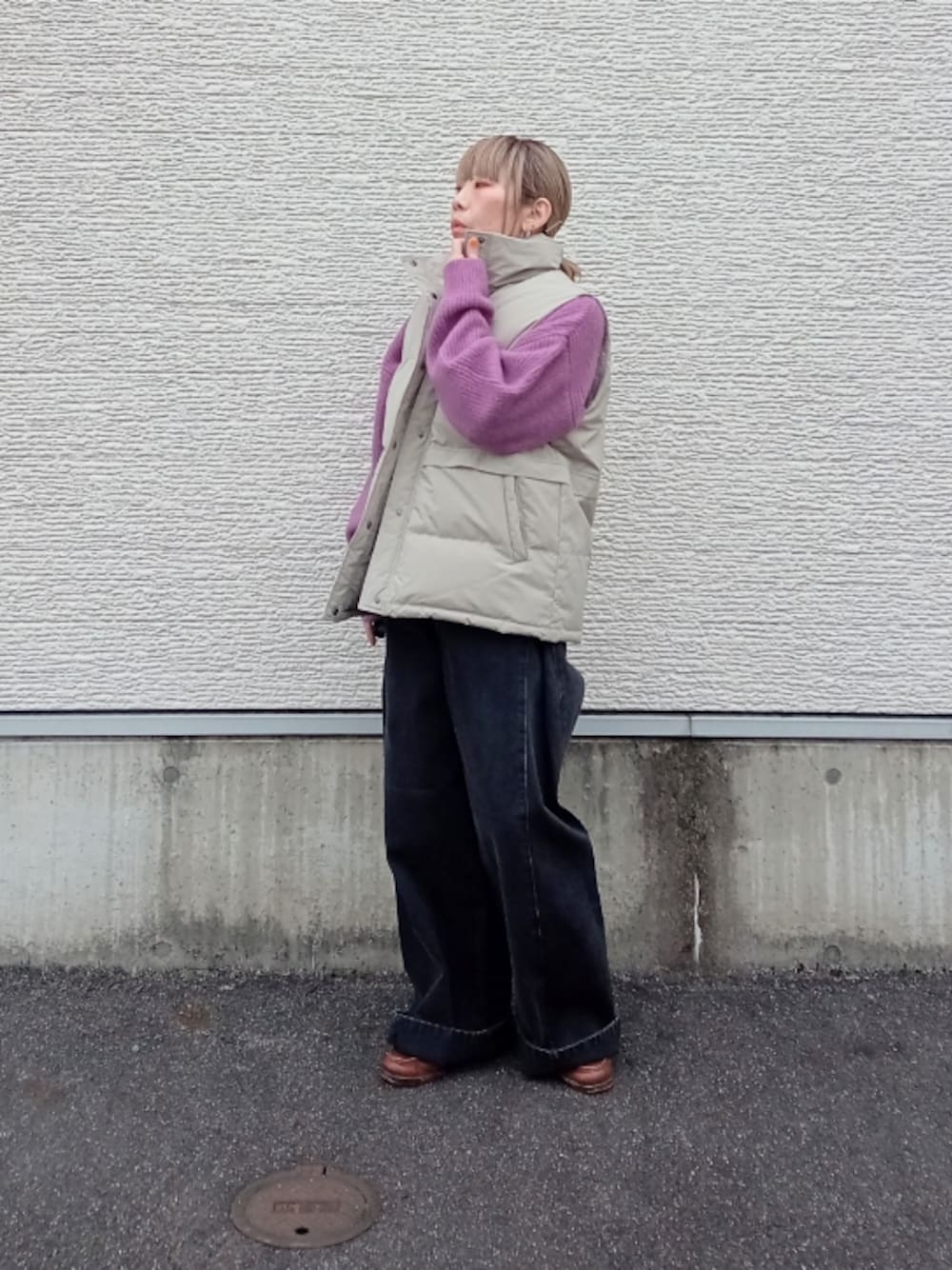 フワフワで肌触りの良いニット🧶 色もくすみカラーで使いやすい色味です。 差し色に◎ ダウンベストはスタンドカラーでお尻まで隠れる丈で防寒もしっかりしてくれます✨ サイドタックの入ったデニムはボリュームがありかわいいです。