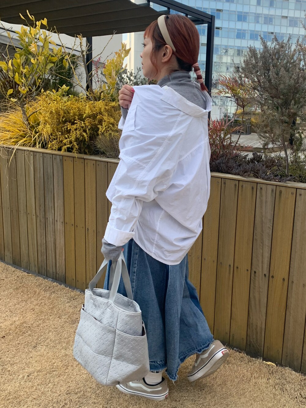 どんどん軽装になっていくのが嬉しい🌸 ネオプレン素材のライトグレーのトートバッグ。 春先も大活躍しそう!