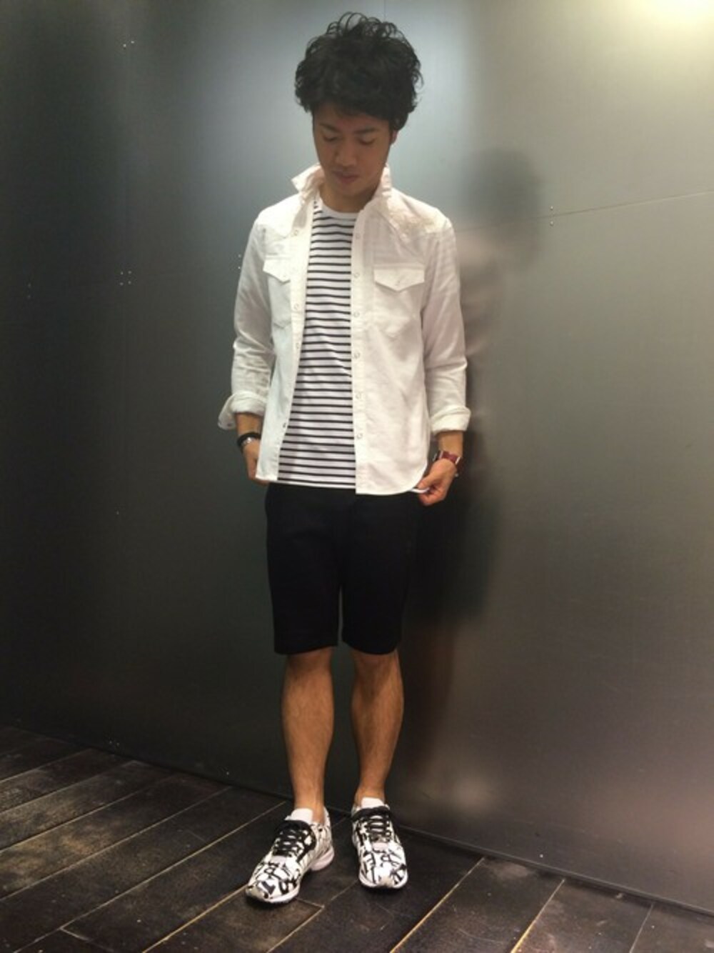 スウェット生地のショーツをキレイ目カジュアルにスタイリングしました。 白シャツにボーダーTを合わせ、爽やかさを演出。 アクセントにシューズは、グラフィックスニーカーを合わせました。