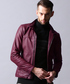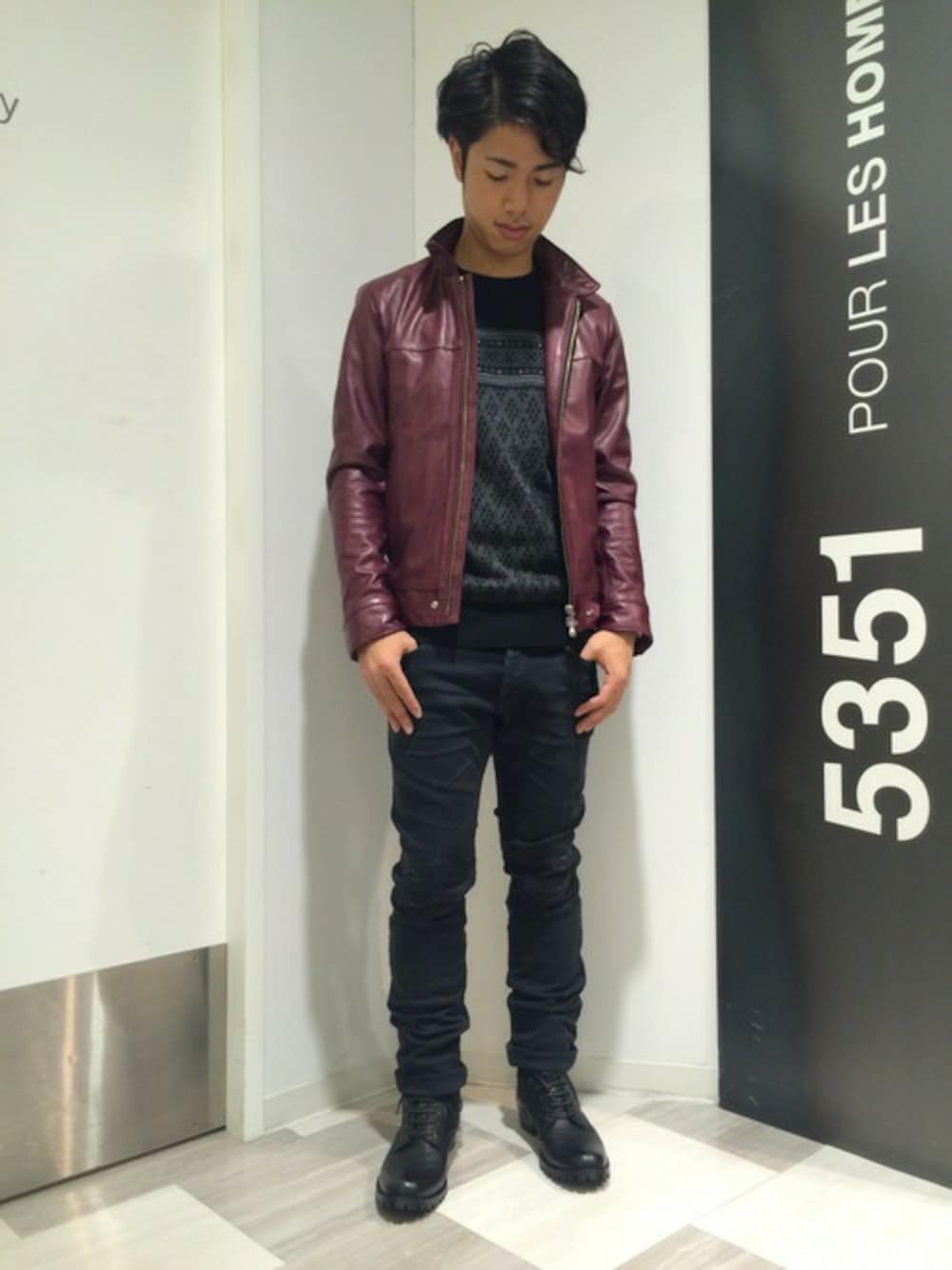 全体をダークトーンに合わせ、 チェリーレッドのレザーがポイントのスタイリング。 インナーは季節感のあるニットを選択。