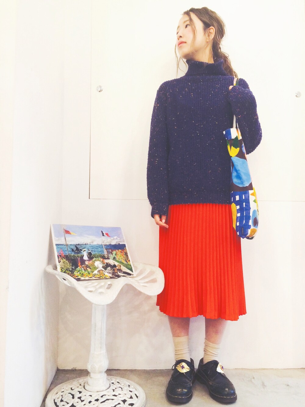 高校の頃描いた摸写した絵に合わせてコーディネートしました。笑 ニットは結構前に買ったものですがネップが入っていて可愛いです。メンズ物です。 色物が好き(^O^)