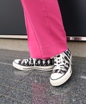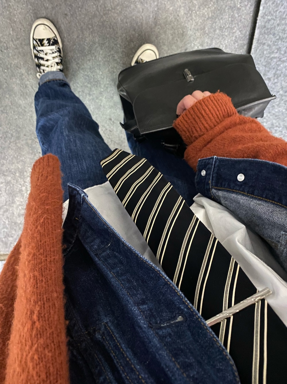 GパンGジャンにオレンジカーディガンで補色 ネクタイとスニーカー配色似ててまとまった 中のシャツはアウトで着てレイヤードレイヤード