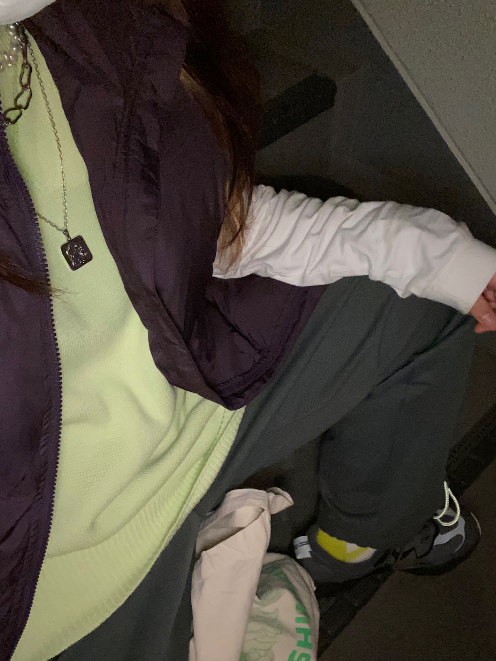 紫と黄緑の補色かわいいね〜〜 パンツのドローコード、ベスト、靴下、トートのデザインをネオンカラーのイエローグリーンで揃えた