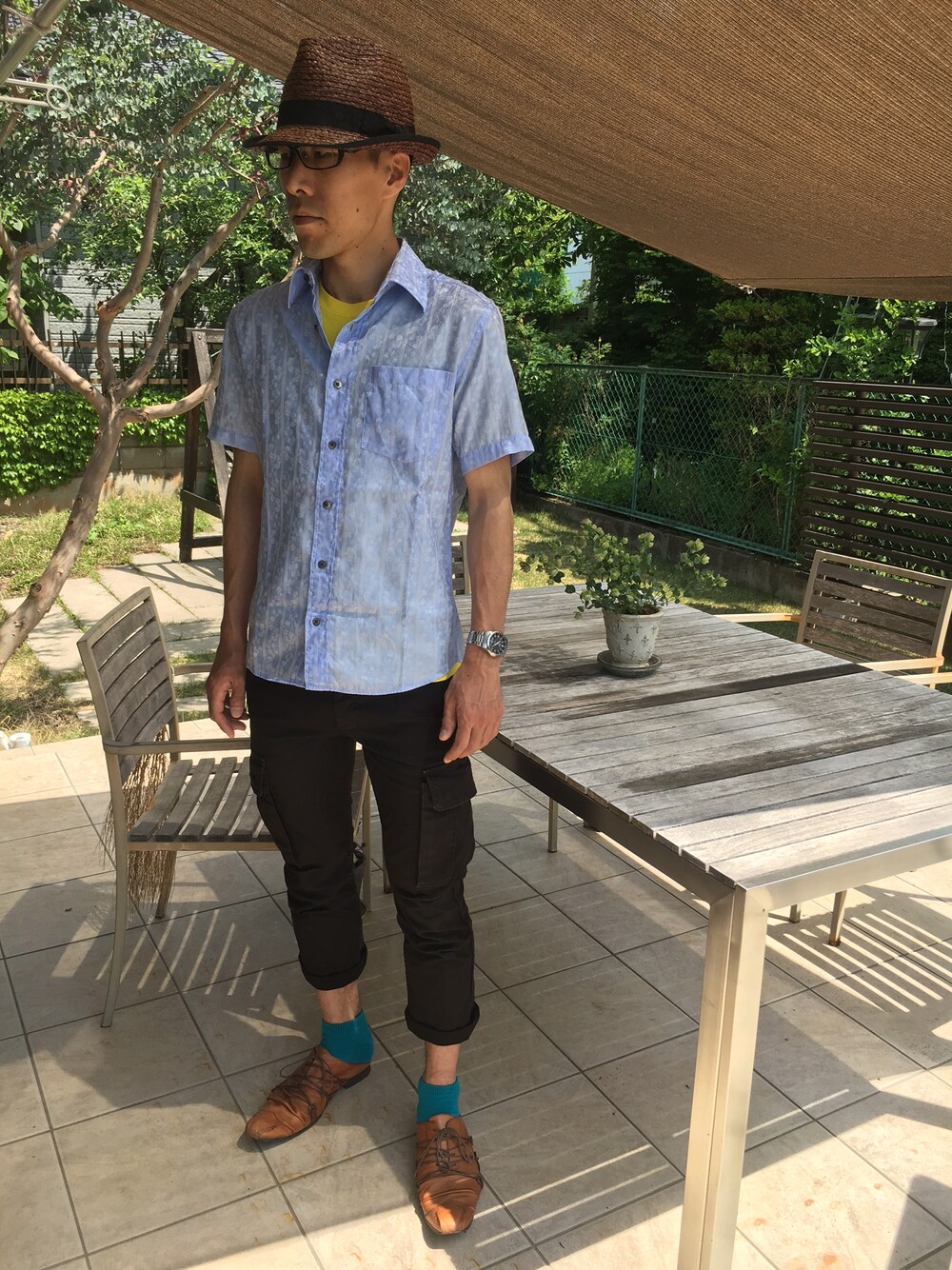 ポールスミスのボタニカル柄のシャツ。10年以上前のものだけどすごく気に入って着ている。最近の同ブランドのボタニカル柄はあんまり好きじゃないけど… 全体的にもうすでに真夏のコーディネートだ。真夏になったら何を着たらいいんだろう。