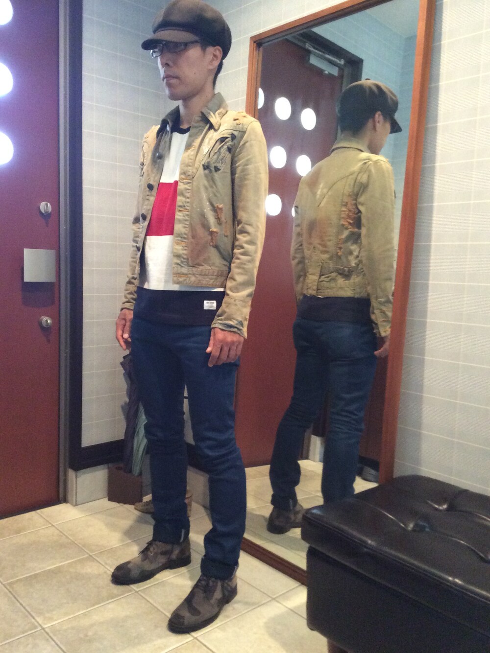 細身のデニムパンツにトリコロールのカットソー。アウターは最近古着屋さんで手に入れたショート丈のダメージデニムのジャケット(¥1300)。シルエットと丈感にこだわった着こなし。