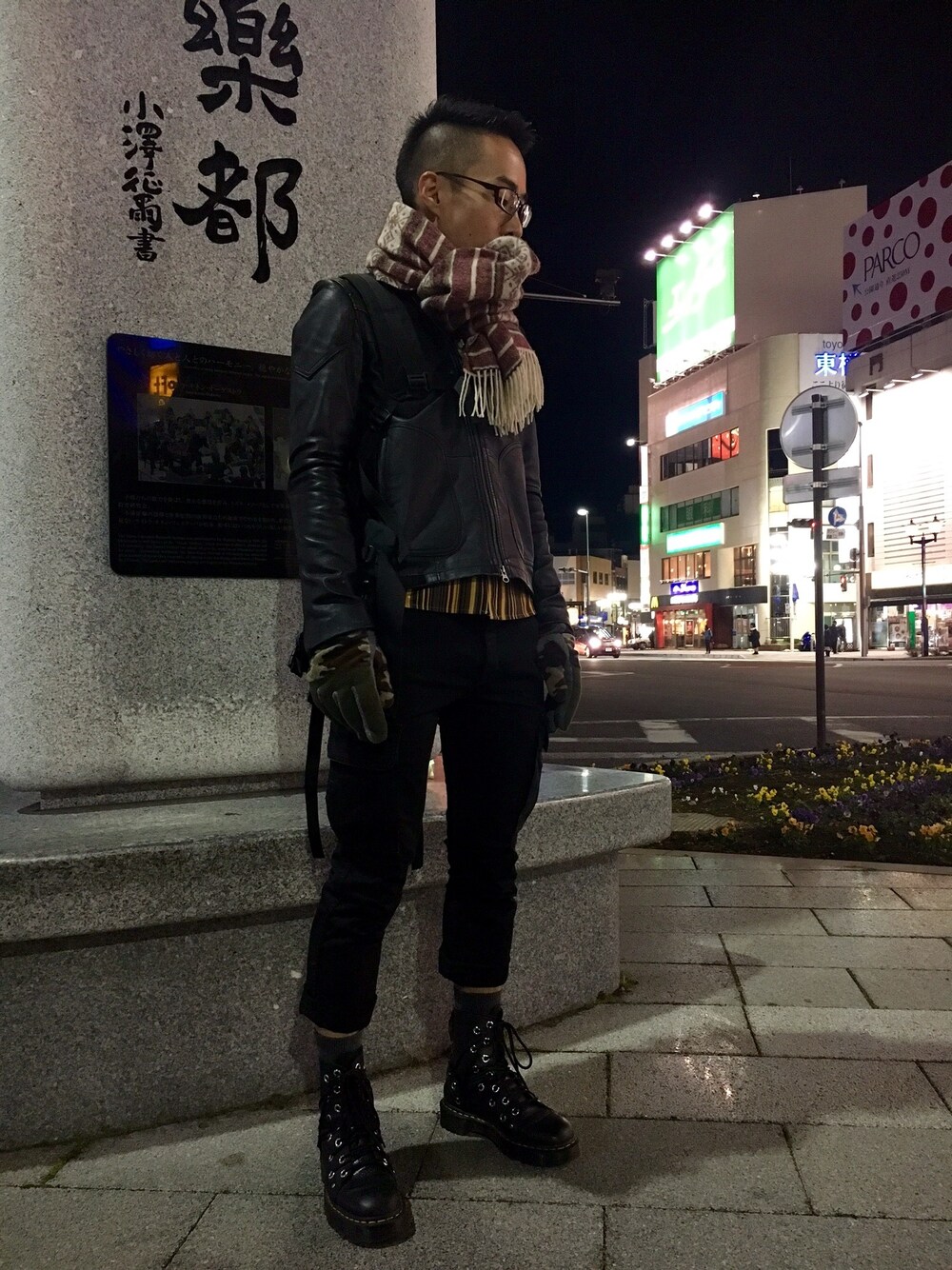 全身黒で夜歩くには危ない格好。タイトなシルエットにこだわった着こなし。