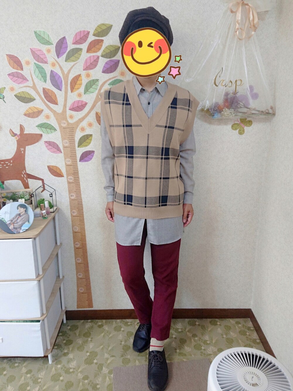 とんこつのベスト「チェックドロップVネックベスト」を使ったコーディネート