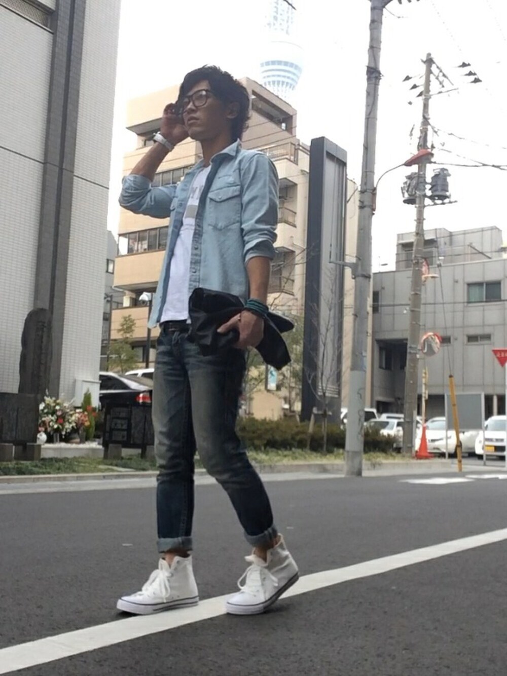 久々『デニムシャツ』で投稿。。 色々考えてたらデニムonデニムになってしまいました! ちょっとクラッチの色が重かったかな? ちなみに後ろに見えるのスカイツリーです笑