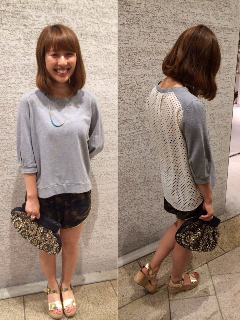 こんにちは。殿元です! 本日はバックスタイルが可愛いトップスのご紹介です! 前はシンプルなデザインですが後ろを向くとレースの透け感が涼し気なこちらのトップスはショートパンツやデニム、フレアスカートなど、ボトムスを選ばず着て頂けます! お色は白、グレー、バックデザインがストライプのタイプもオンライン、展開店舗限定でなんば店にもご用意あります! 私はグレーがオススメです★ 是非店頭でご覧下さいませ! トップス/アメリカンラグシー ボトムス/ローレンスドリジェ サンダル/ファビオルスコーニ バッグ/モイナ