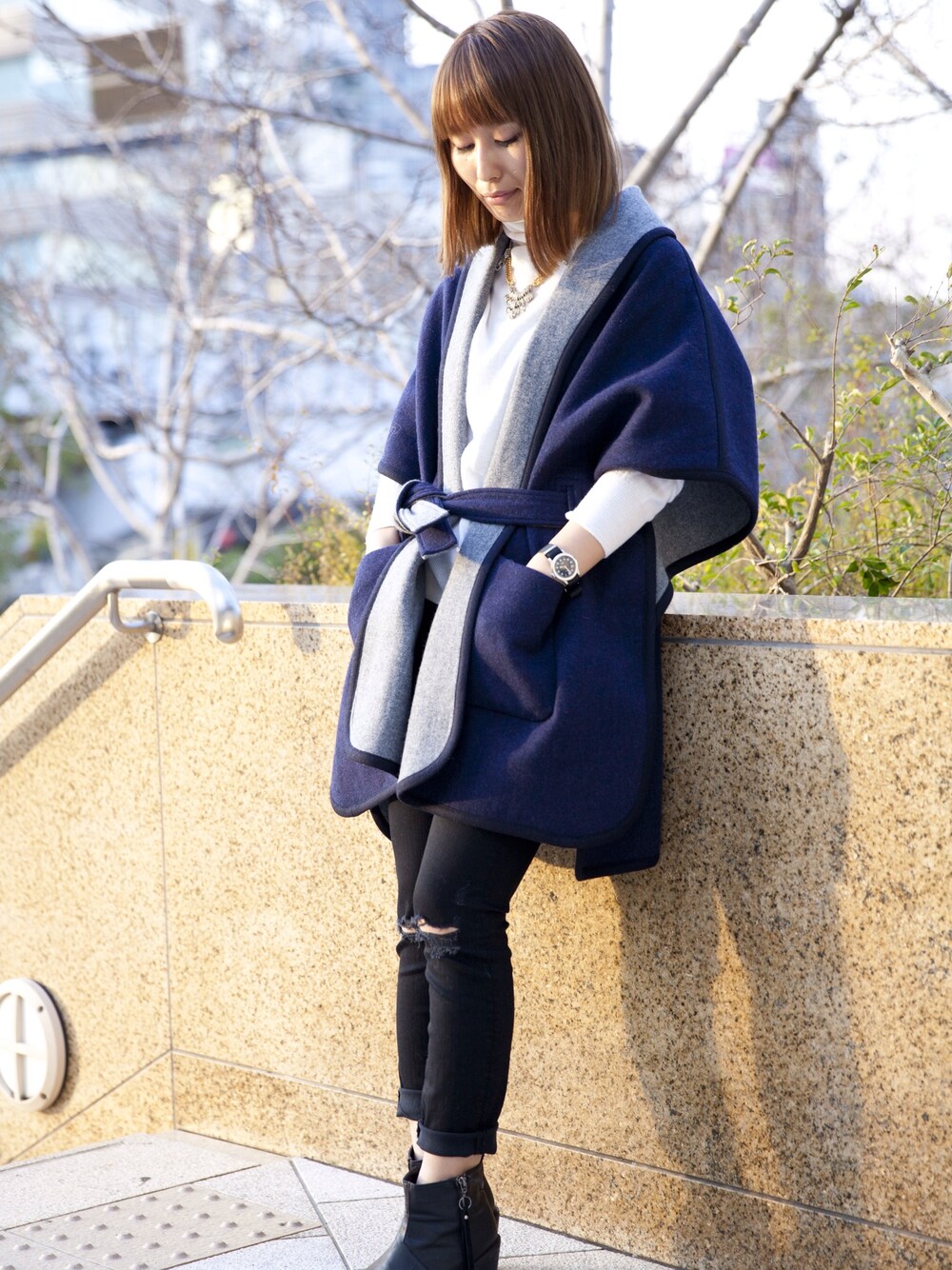 こんにちは! ご覧いただき有難うございます。 本日はポンチョメインのコーディネートです! 今年トレンドのタートルと、ダメージデニムを合わせてみました! このポンチョ、実はリバーシブルなんです... お得感ありますよね...♡ なんばパークスにお越しの際は是非見にいらしてください☺︎