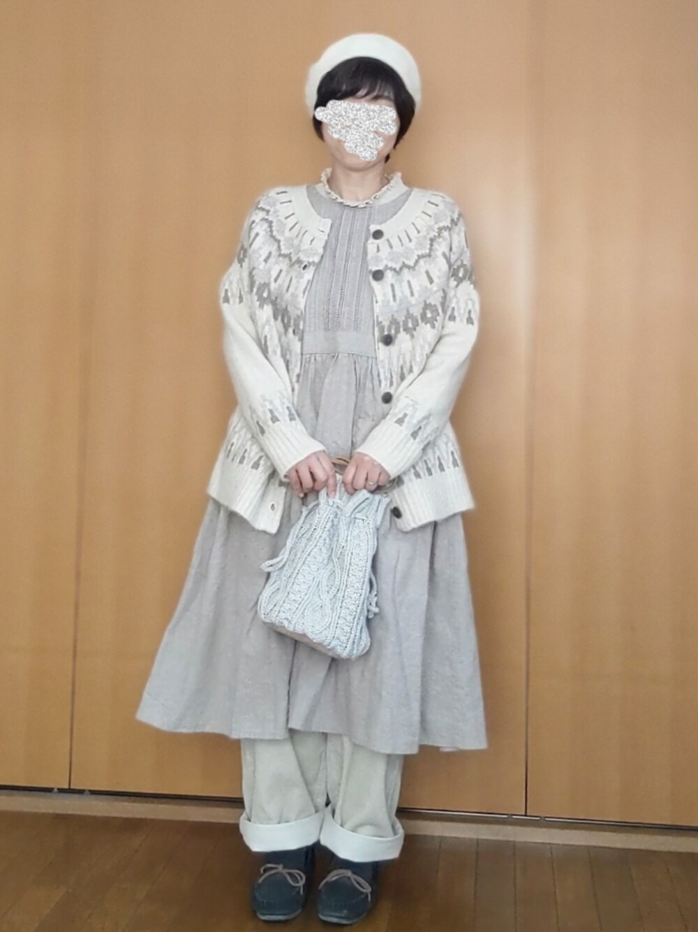 ホームズのエプロンを使ったコーデ。ワントーンでまとめてみました。 ジャガードニットはモチモチしていてとってもあたたかくて使いやすいです。