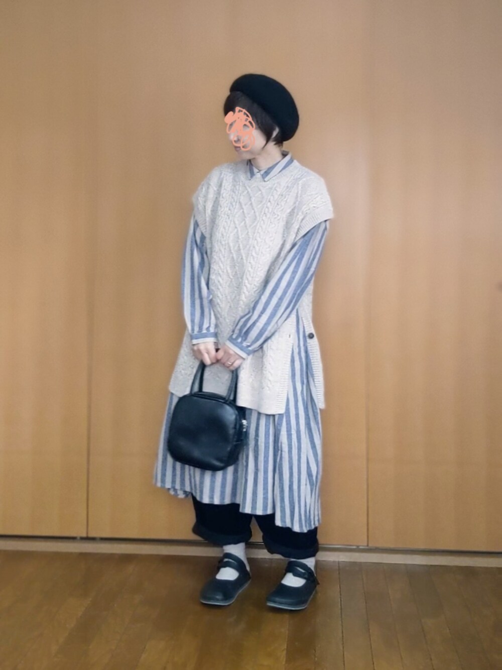 お気に入りのベージュとブルーのストライプシャツワンピにケーブルニットベストをあわせました❄️