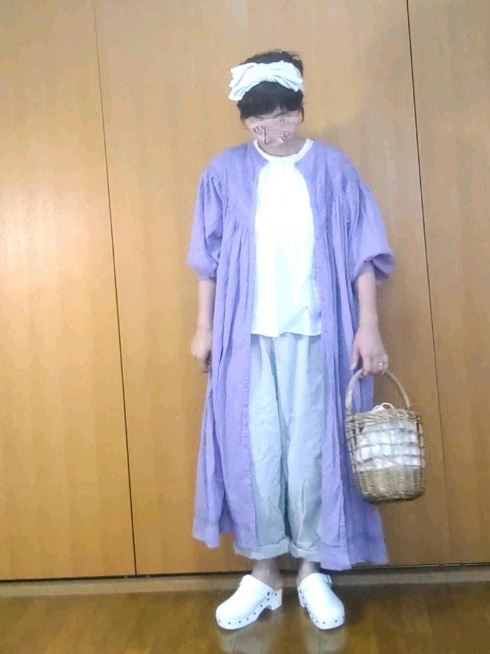 前回のラベンダーv切替ワンピの着回し🍇 スタクリさんのかごバッグセールで安く買えました🧺✨ あと、このターバン意外とバランスが取りやすいです😆💕 いいね❁お気に入り 素敵なフォルダinありがとうございます❤とっても嬉しいです🥰