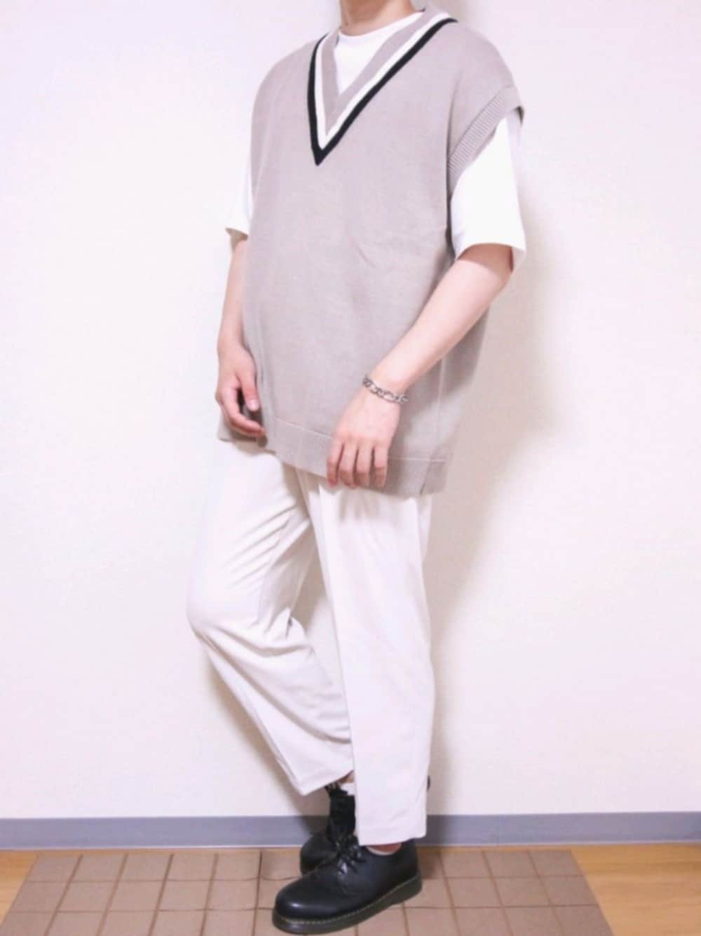 Yuu のニット/セーター「ウォッシャブルコットンチルデンベスト ベージュ」を使ったコーディネート