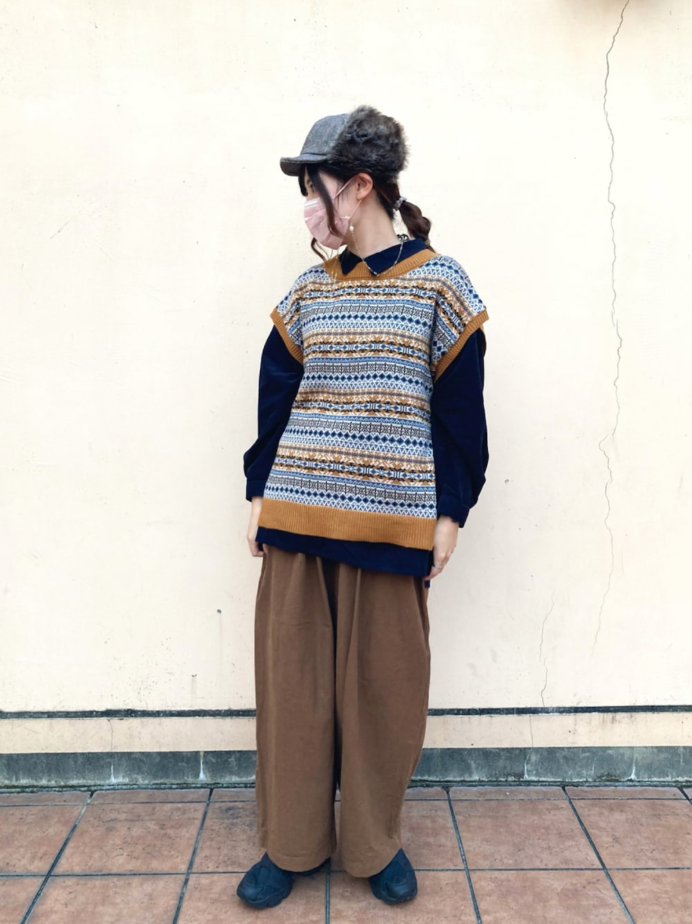 💛イエロー×ネイビー💙 古着っぽい少しボーイッシュなスタイルにしてみました! 入荷したてのニットベストは期間限定でただいまお安くなってます🧶 パンツは履いてみるととても可愛いシルエットだったのでお勧めです👖