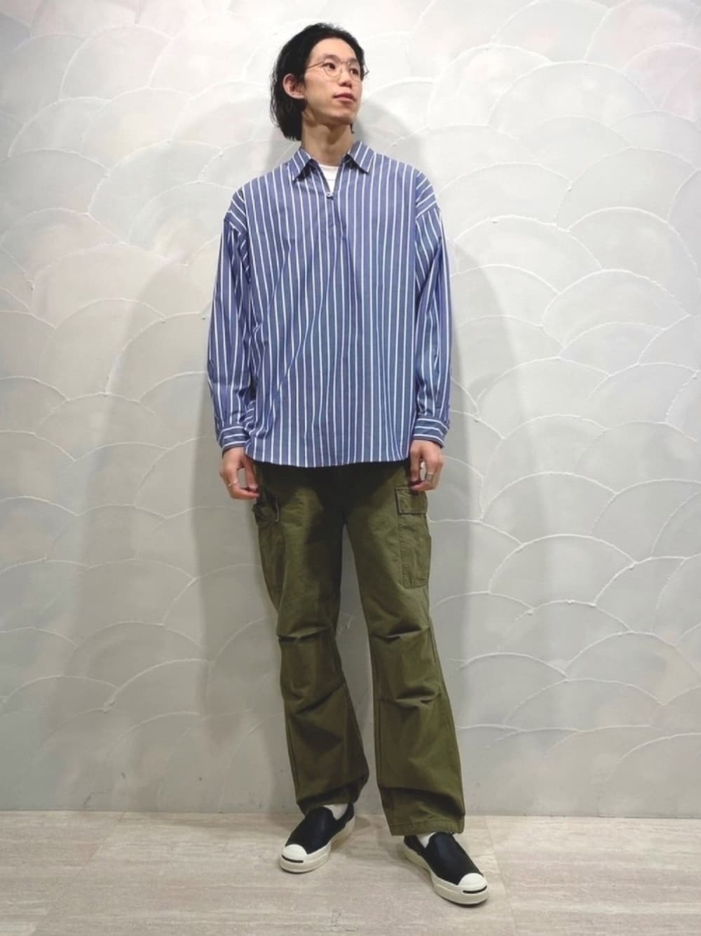 前回のストライプシャツのコーディネート別バージョンです。