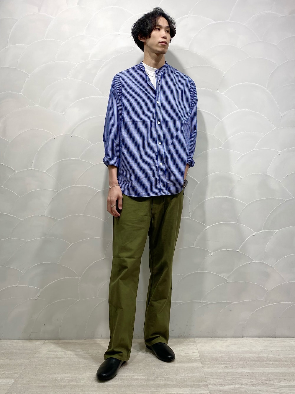 styling 以下商品詳細です。 トップス Lサイズ着用 【サイズ感】 ジャストなサイズ感でジャケットのインナーにも使えます。 【素材感】 コットン100%なので肌触り良いです。 【着心地】 滑らかな肌触りなのでサラッと羽織れます。 ボトムス Lサイズ着用 【サイズ感】 細すぎず、きれいなシルエットのストレートスラックス 187cmでLサイズ着用してますが、丈はジャストぐらいなので少し落として履くと良いです。 【素材感】 少し落ち感のあるルーズでこなれたカジュアルな雰囲気が出ます。 【着心地】 厚すぎず、薄すぎず程よい生地感なのでストレス無く履けます。