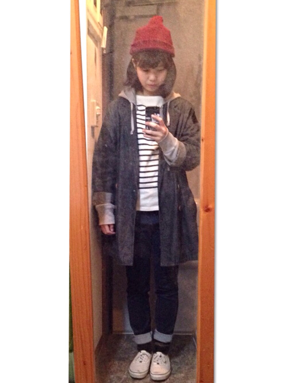 中にパーカー着てジャケットから出しました(^O^) ユニクロのパンツ色とストレッチさがお気に入りです