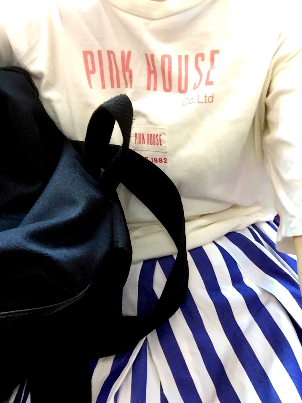 ピンクハウス!!母のだけど!! Tシャツにブルーのストライプスカート! すっきりめコーデに。