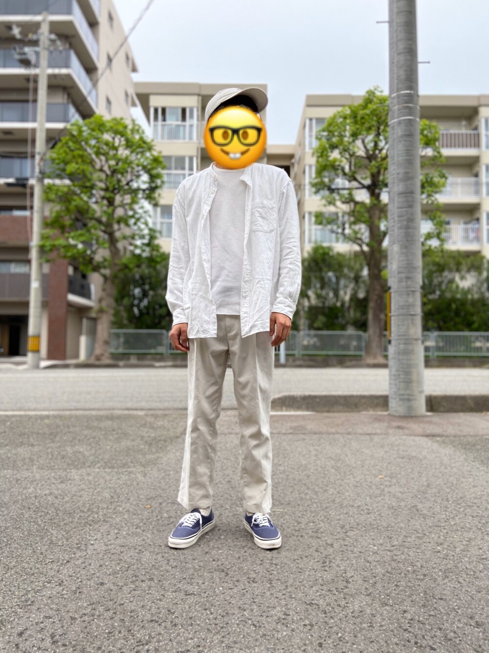 こんにちは! いつもお気に入り、いいねありがとうございます😊 今日のコーデはオール白コーデにワンポイントで青のスニーカーを合わせてみました! もっと鮮やかな色のスニーカーの方が良かったのかなとも思ったけど、どうだろう🤔