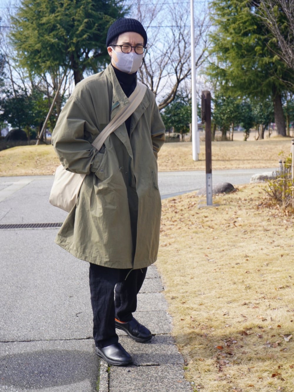 モノトーンでまとめて、差し色にオレンジのソックスを持ってきました。 暖かったのでアウターはフリークスストアのモッズコートを着ました。