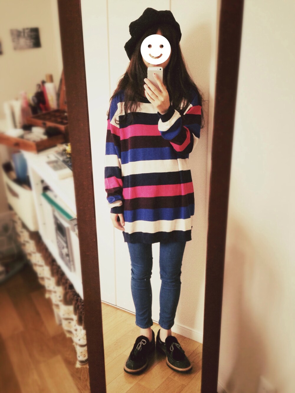 あ!今回靴履きました。えっへん。 H&Mで一目惚れしたカラフルなボーダーニットは大きめサイズにしてゆるゆる〜と着ました。 楽チン最高だぜ!