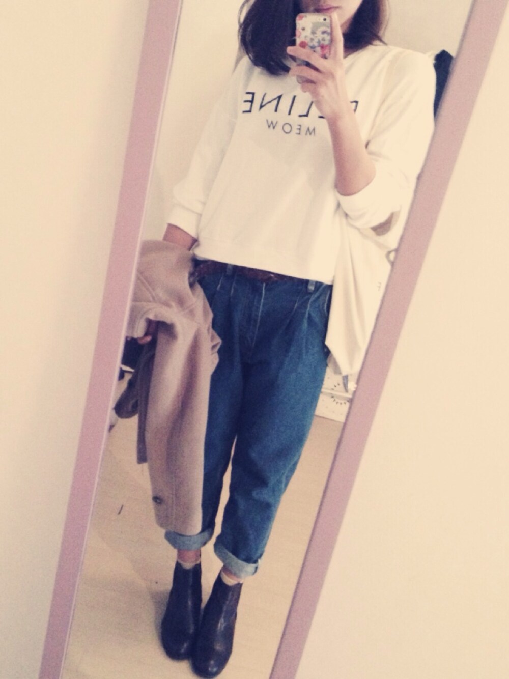 ブルー系のデニムパンツを着用したレディースの秋コーディネートの1枚目の写真