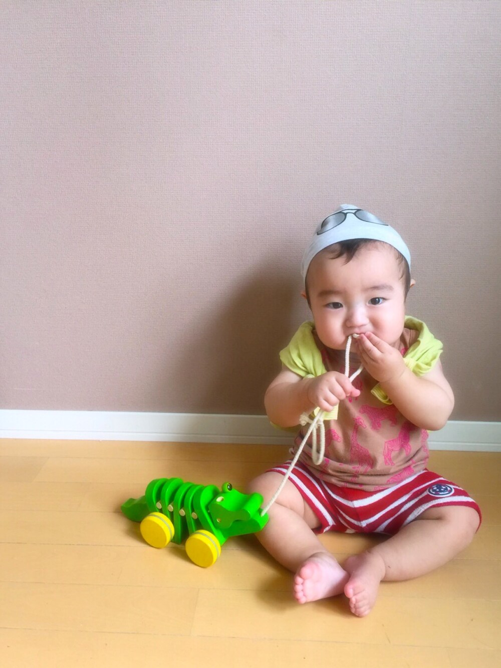 弟くん7ヶ月☺︎ 好きだよねーヒモ。 ヒモ吸ってると、落ち着くんだよね。 TOTALでも2000円いかないくらいの、超プチプラコーデです。