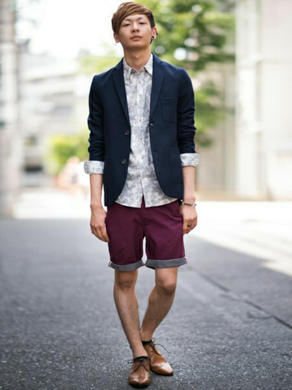 フランネルのアンコンジャケットをショーツと ロールアップでインナー&裏地見せ