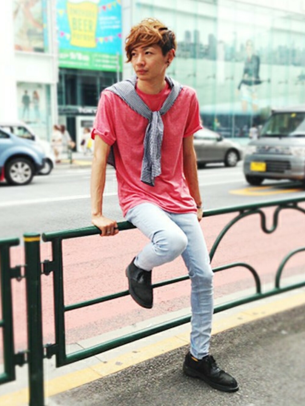パステルカラーで遊んだコーディネート ギンガムチェックシャツは肩掛けが今の気分 TOPMANのデニムはとてもスキニー!だけどストレッチが効いて履きやすい