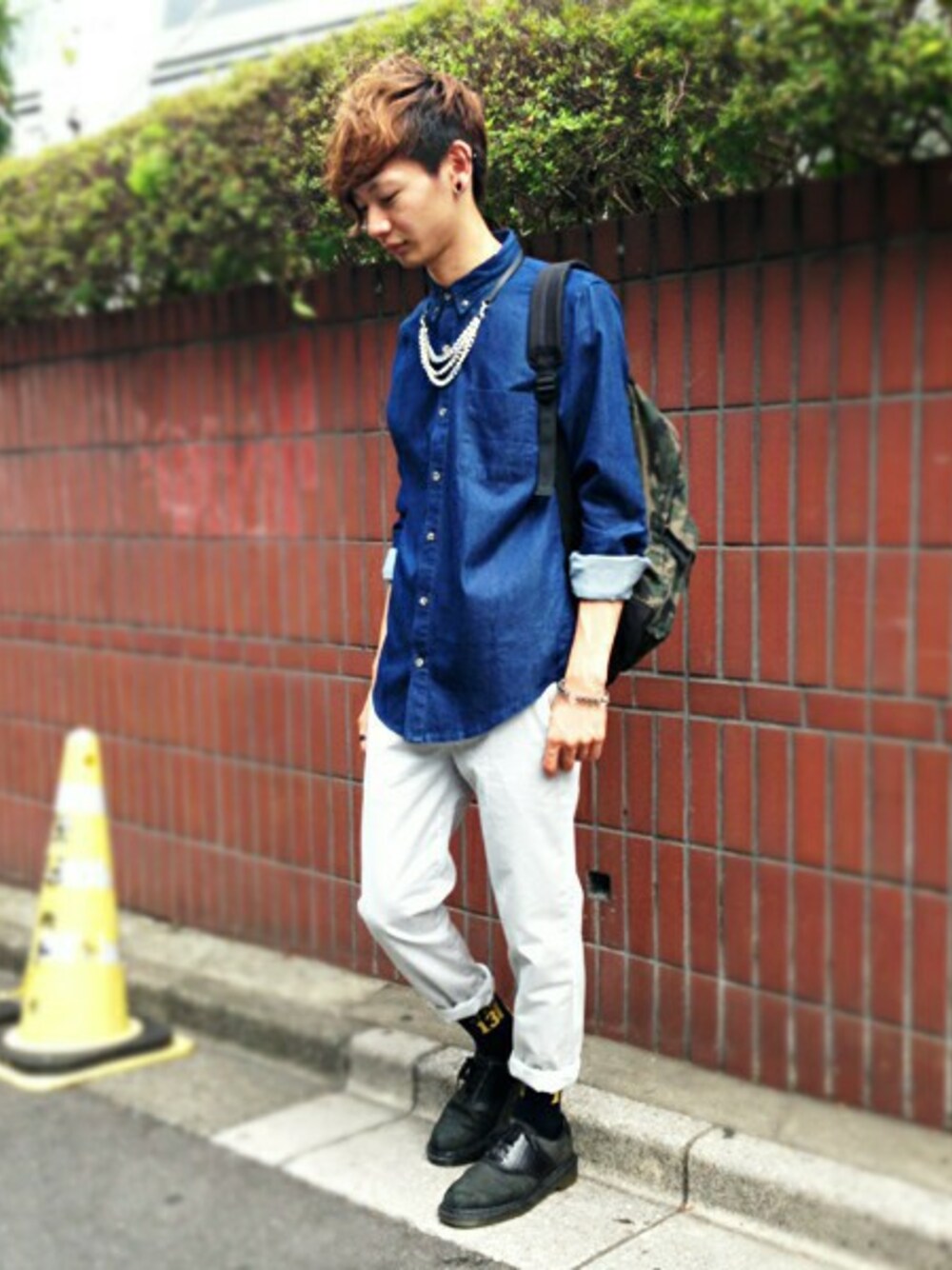 デニムシャツは全ボタン留めとロールアップにアクセサリーの合わせ技で着こなす ペールグレーのチノパンツで濃紺を強調させて